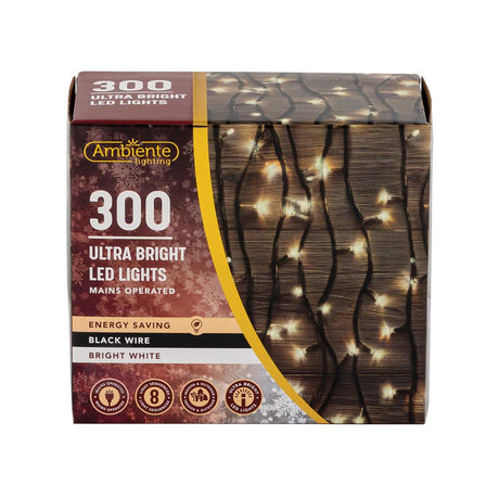 300 Ultra Bright LED String Lights Mains Operated & Black Wire Bright White